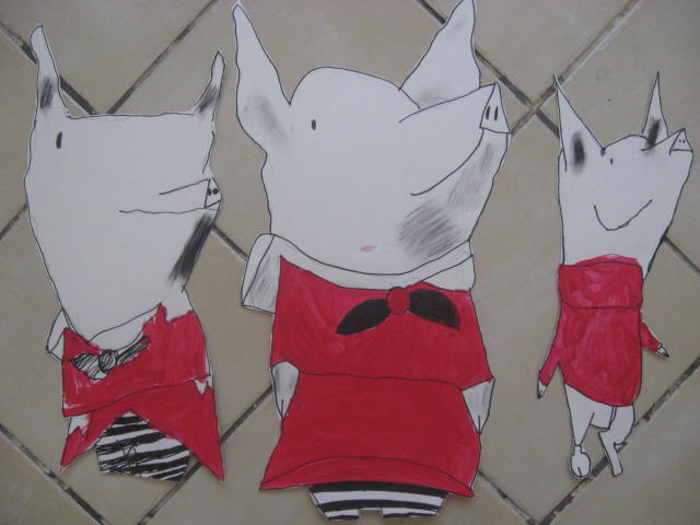 Sometimes I don't have to look any farther for inspiration for an art lesson than my daughter's bookshelf. So my Thursday afternoon group of Kindergarten thru 3rd graders took a look at the adorable (and familiar to all of them) Olivia by Ian Falconer. In the story Olivia's mother takes her to an art museum on rainy days. She always heads straight for her favorite Degas ballet piece. From there she stands in front of Jackson Pollock's Autumn Rhythm #30. Her reaction, "I could do that in about five minutes."So I thought it would be fun do a line drawing of Olivia the pig with smudged charcoal shadows and her trademark red outfit and combine it with a splattered piece. The boys swapped the sailor dress for a red turtleneck, turning their pig into more of an Oliver. (my apologies to Mr. Falconer :) The children took turns with some Abstract Expressionism using watered down black and white tempera on a sheet of construction paper. The pigs (all so wonderfully different and full of humor and character) were cut out and placed in front of their splattered art piece and mounted on black posterboard. Nice job kids!
